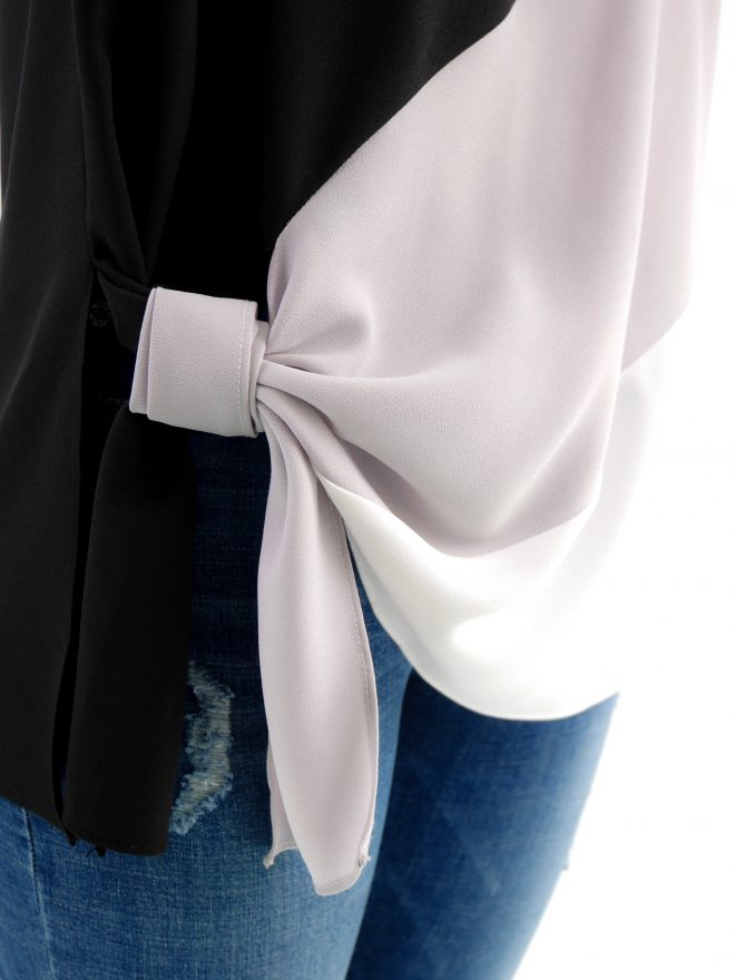 三色接拼打結雪紡上衣 – 黑色